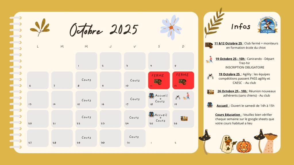 Entre cours d’éducation, canirando, réunion des nouveaux adhérents et passages d’agility, le mois s’annonce riche et animé.