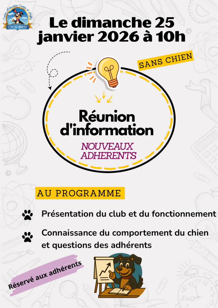 🔹 Une réunion d’accueil pour les nouveaux adhérents (sans chiens) le dimanche 25 janvier à 10h au club