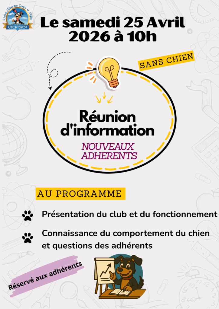 👋 Samedi 25 avril à 10h : Réunion des nouveaux adhérents (sans chiens) – au club Une belle occasion de découvrir notre fonctionnement et poser toutes vos questions !