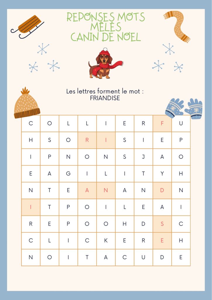 Tu as joué le jeu du mot mêlé canin de Noël ? Bravo ! 🎉 Voici la correction pour vérifier si tu as bien retrouvé tous les mots… et surtout, si tu as découvert le mot mystère avec les lettres restantes 🕵️♀️✨