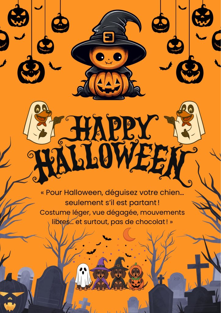 Un petit costume ? Pourquoi pas… 👉 S’il est à l’aise, peut bouger librement, voit bien… et surtout : pas de chocolat ! 🍫🚫 Fêtez en toute sécurité et amusez-vous bien ! 🐾🕸️