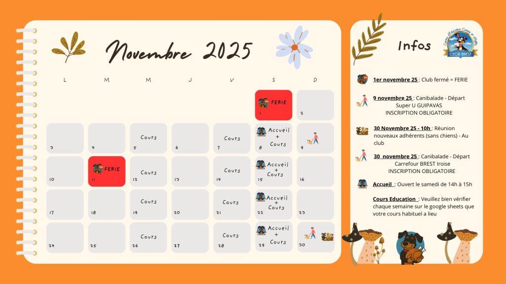 Le club sera fermé ce samedi 1er novembre pour laisser place aux balades automnales, aux siestes canines et aux restes de bonbons d’Halloween 🎃🍬 On se retrouve dès le week-end prochain pour reprendre les activités avec énergie et bonne humeur !